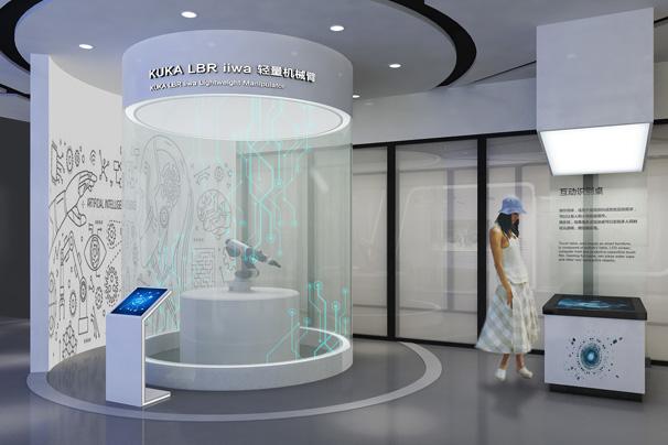 “企業(yè)數(shù)字化”、“騰飛未來”等板塊,展廳主要通過搭建多個場景還原訊飛產品在現(xiàn)代生產生活中的應用,同時通過互動觸摸屏、物體識別桌、機械臂、VR等創(chuàng)意性展項,將訊飛企業(yè)理念、產品核心賣點與展項及場景相融合,智能化的展項與科技風的空間風格既凸顯了科大訊飛企業(yè)智能化的特點,同時也助力展示企業(yè)的核心優(yōu)勢與價值理念。